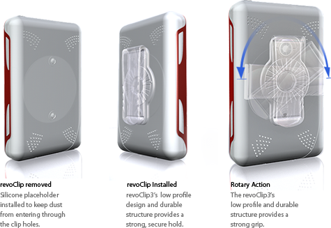 The evo4 comes with a fully removable rotary belt clip system (revoClip3) that integrates seamlessly to keep you and your iPod connected. Its low profile design isnt bulky and its durable polycarbonate structure provides a strong hold. The revoClip3 can easily be removed for an even leaner look and includes a soft silicone placeholder to block the evo4 Duo's rear clip holes and prevent dirt from entering.