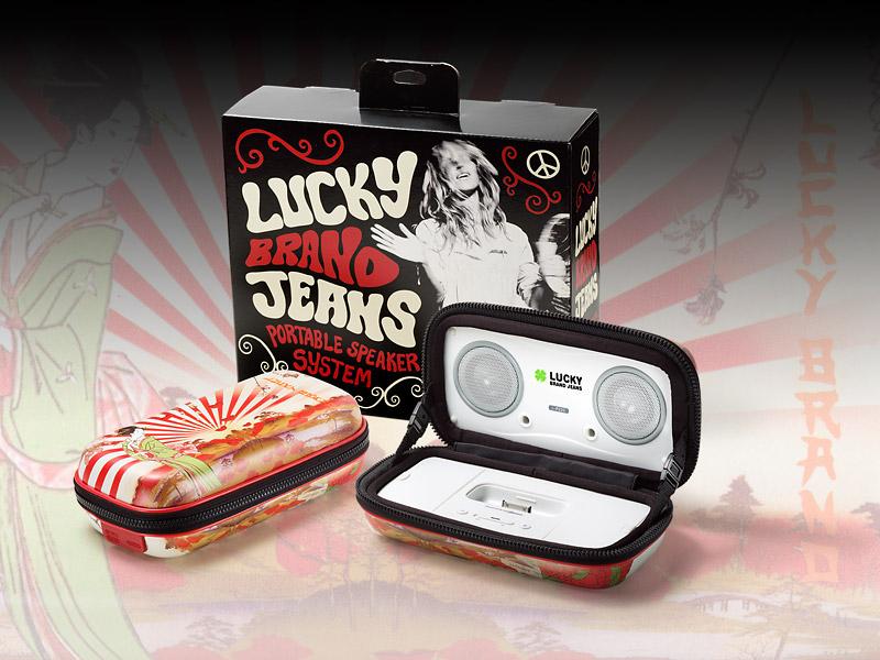 This is a special edition of Sonic Impact’s iP22 Portable Speakers, the Lucky Brand system offers a built-in iPod Dock, and an integrated carrying case with a zippered closure and a unique Asian-influenced design inspired by Lucky’s men’s and women’s clothing on the fabric outer shell. Other features include a strap for portability, 24-hour battery life and an included power adapter for charging, and an integrated amplifier.