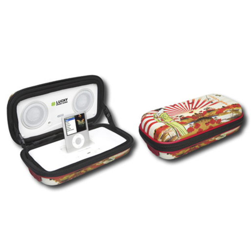 The Lucky Brand iP22 Geisha case is bright, perfect for summer and includes a built-in dock that you can conveniently pop your iPod, iPhone or iPod Touch on. The exterior is nice and hard so that the speaker component stays nice and safe and expect to get up to 24 hours on AA batteries (it also works with an AC adapter). Enjoy the splash of a Lucky-designed cover along with amazing sound--all in one wonderfully portable package. Its possible because the i-P22 includes aluminum cone neodymium drivers for clarity, ported speaker housings, and advanced MaxxBass technology that provides an enhanced bass response while minimizing distortion. Housed in a specifically engineered hard case, the i-P22 not only protects the speakers and iPod while traveling, it also serves as a speaker cabinet--producing better audio output.